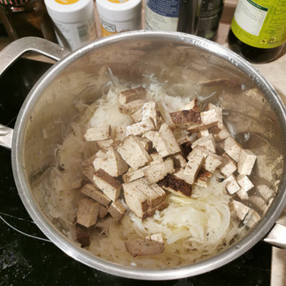 Commencer par préparer la choucroute. Ciseler un oignon puis le faire revenir dans un peu d'huile d'olive. Saler. Laver la choucroute crue à l'eau froide lui l'ajouter dans le faitout avec l'oignon. Salez et poivrez. Faire venir 10 minutes environ. Ajouter l'eau, couvrir et laisser cuire à feux moyen pendant 40 minutes. Vérifier de temps en temps s'il ne faut pas rajouter un peu d'eau. Couper le bloc de tofu en "lardons" puis l'ajouter dans le faitout au bout des 40 minutes. Bien remuer. Faire cuire encore 10 minutes à couvert. Enlever ensuite le couvercle et faire revenir la préparation 10 min environ.